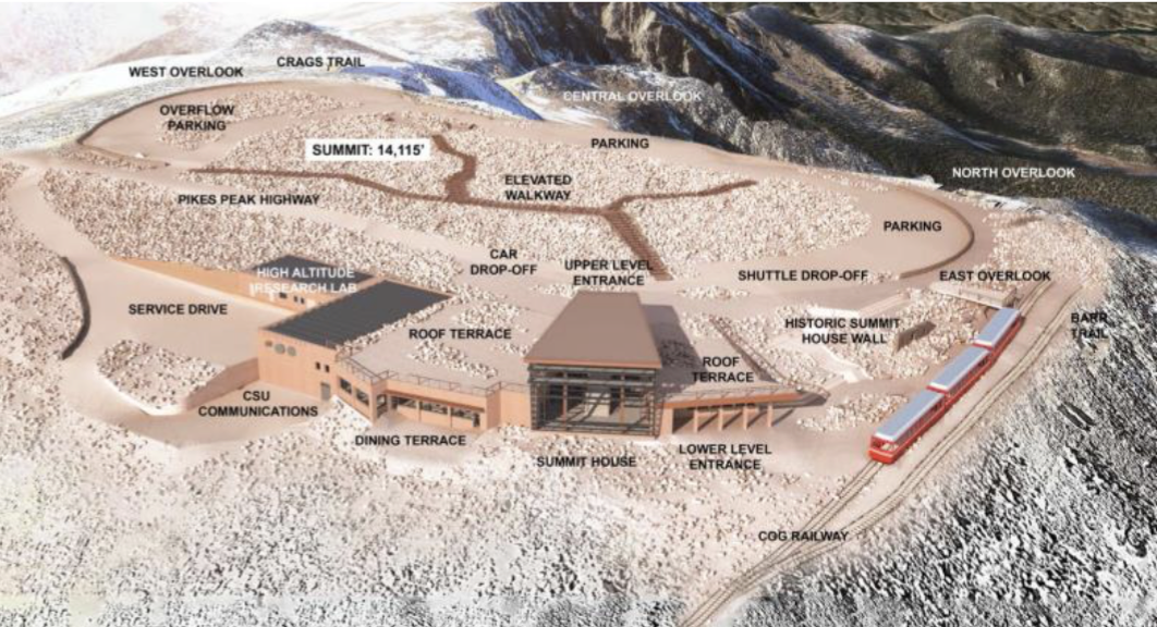 In 1998, an observatory was part of the Summit House design. This plan was shelved to allow paving of the Pikes Peak Highway to the summit, completed in 2011. A new Summit Complex design was developed and presented to the public in January 2016.